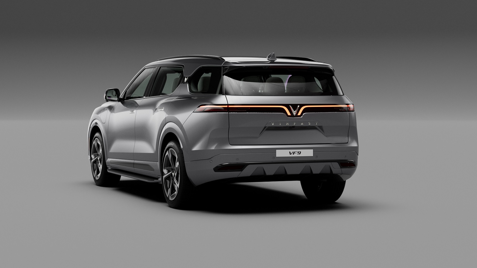 Hình ảnh VinFast VF 9 mạnh mẽ hơn khi sở hữu phần cản sau góc cạnh, đi kèm với đó là cánh gió thể thao, khỏe khoắn.
